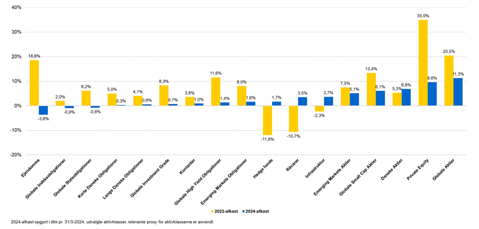 Grafikken er sorteret efter 2024-afkastet. Højeste afkast i 1. kvartal er aktier fra veludviklede lande med 11,3 pct. Næsthøjeste afkast blev private equity med 9,6, pct. Ejendomme er påvirket negativt af rentestigningerne her ved årets start.