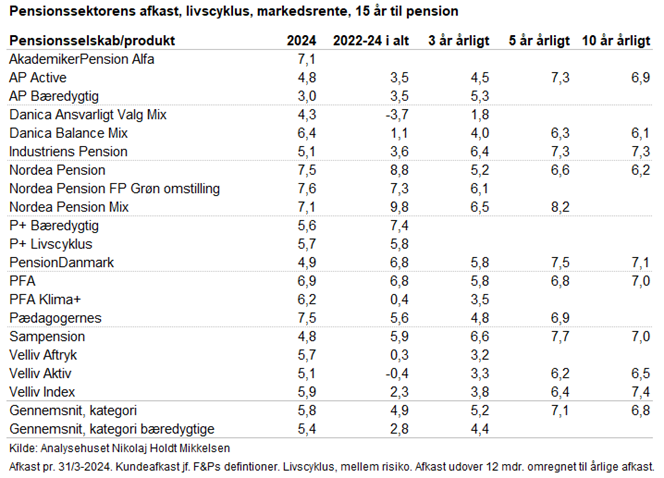 Den positive udvikling på finansmarkederne smittede af på danskernes pensionsopsparere. Tabellen viser bl.a. 2024-afkastet suppleret af løbende afkast over længere horisonter for markedsrenteprodukter med middel risiko og mellemlang horisont til pensionering. Løbende afkast opgjort pr. 31/3-2024.